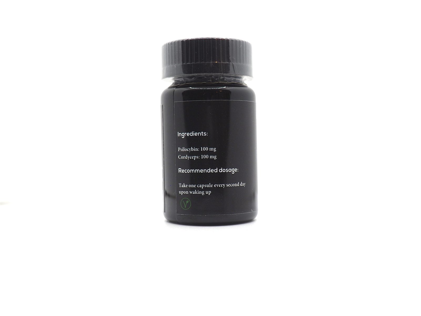Each bottle contains 30 capsules. Each capsule is 200mg (100mg of Magic Mushrooms, 100mg of Cordyceps).