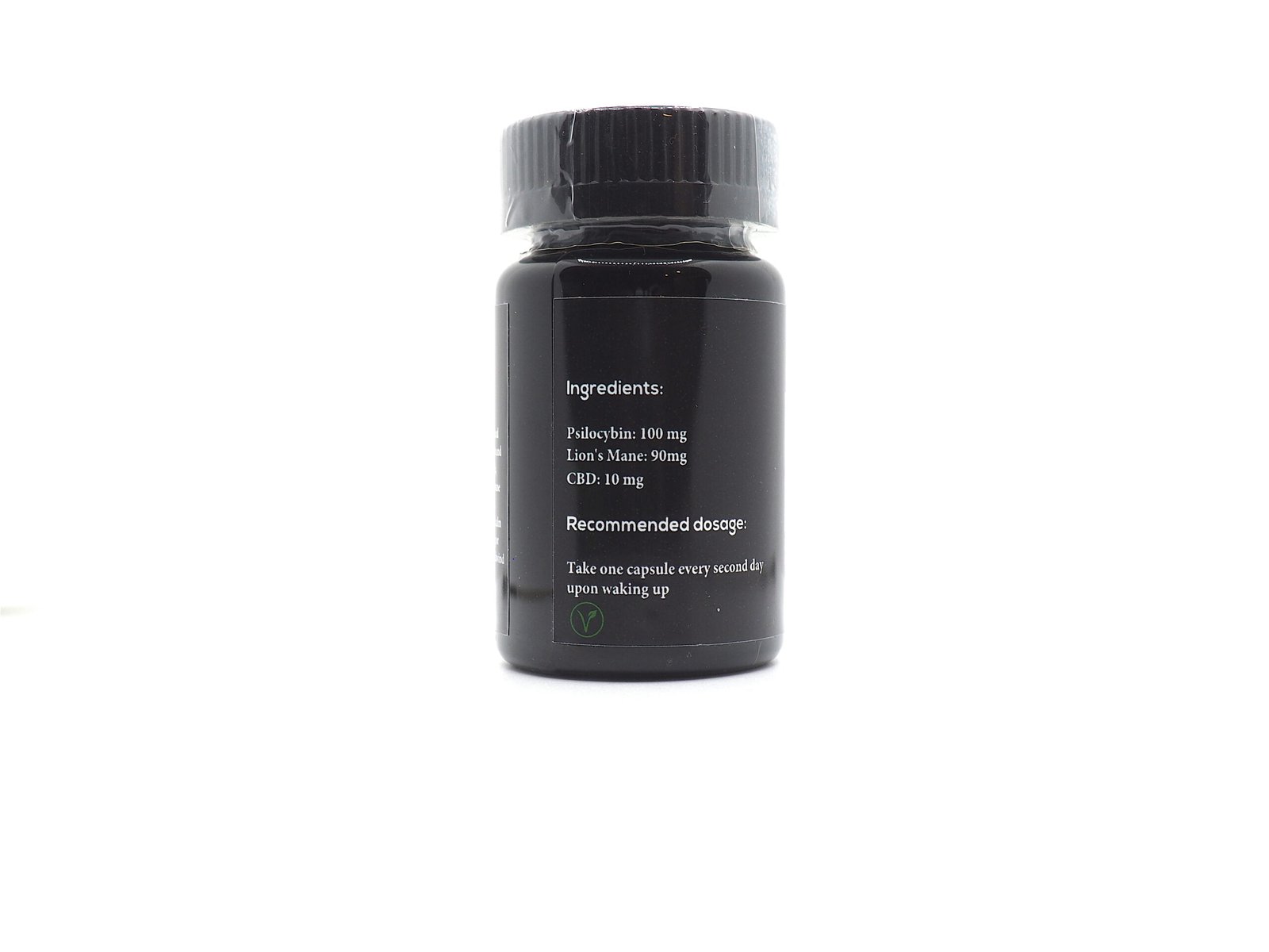 Each bottle contains 30 capsules. Each capsule is 200mg (100mg of Magic Mushrooms, 10mg of CBD, 90mg of Lion’s Mane).