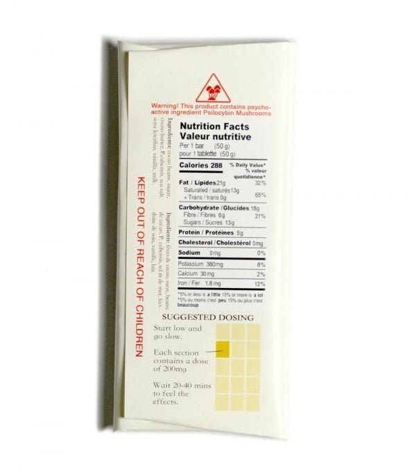 Each milk chocolate piece consists of 500mg (0.5g) of organic Psilocybe Cubensis Mushrooms blended evenly into GMO-free, premium Belgian chocolate. There are no artificial flavors and no hydrogenated oil used in the chocolates.